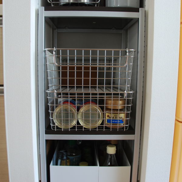 調味料は目隠しできて、上段の水切りカゴに合わせて、ステンレス素材に統一。