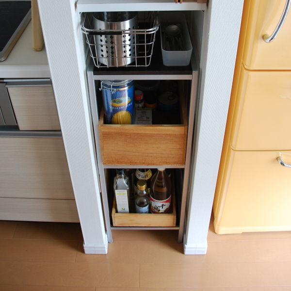 パスタや、使用中の調味料、ストックしている果実酢などを収納。