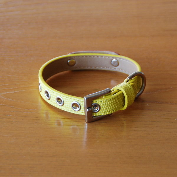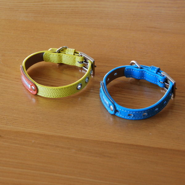 昨年の秋に購入した水色の首輪&タグ(写真右)がとても可愛くて気に入ったので、今年は誕生日に黄色い首輪(写真左)を色違いでオーダーです。