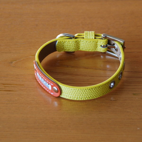 もんすけの7歳の誕生日プレゼントに【犬の首輪屋 てるべる】の迷子札付きの首輪をオーダー。【SSサイズ レモンイエロー】の首輪に【オレンジ】のネームタグを選び、名前と電話番号を入れてもらいました。
