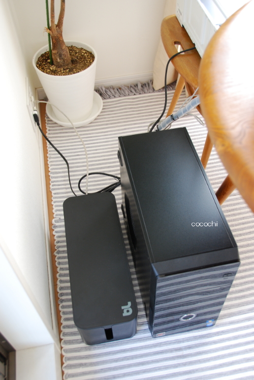 さっそく、ケーブル類をボックスに入れ、PC 本体と壁の間に設置しました。
