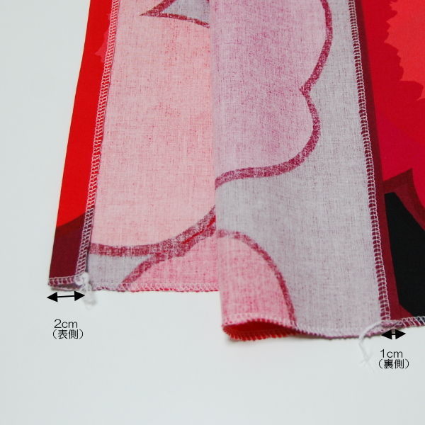 ①布の四辺に端ミシンをかけ、背面端を1cm、前面端を2cm折る