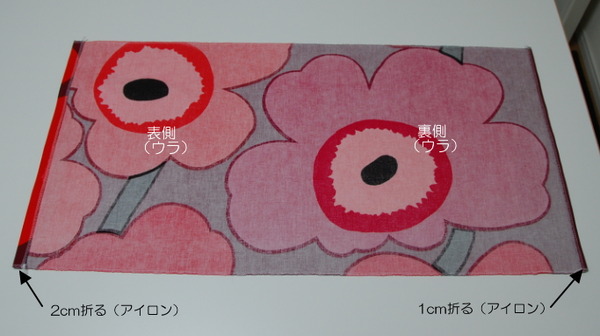 前面の端を2cm、背面の端を1cmそれぞれ折り、アイロンをかける。