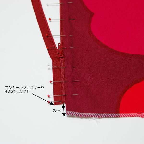 50cmのコンシールファスナーを43cmにカットして使いました。