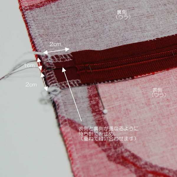 ファスナーの無い部分は2cmに折った端(前面)と1cmに折った端(背面)が少し重なるようにして、一緒に縫います。