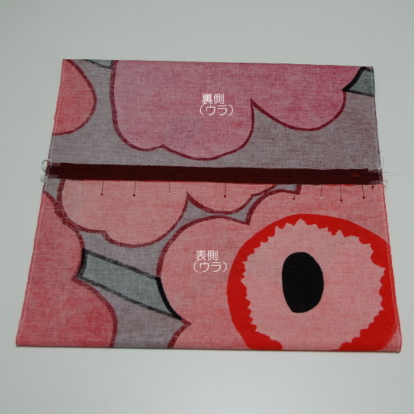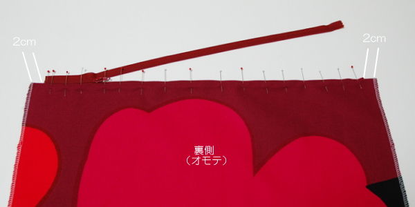 取り付けたファスナーを開け、両端を待ち針で留めます。