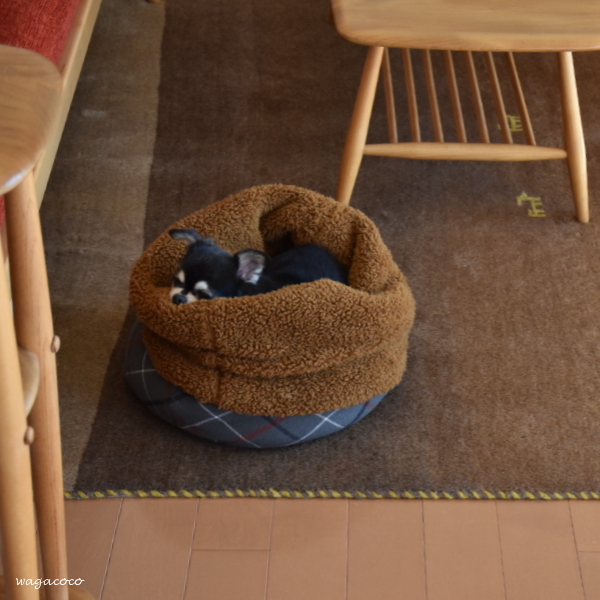 季節の変わり目、もんすけはねぶくろベッドにもぐったり、もぐらなかったり。