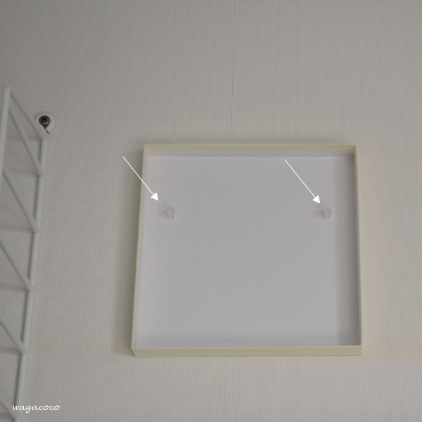 下箱に開いた二つの穴に画鋲をさして、壁に固定。