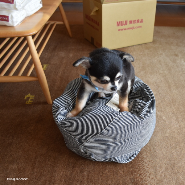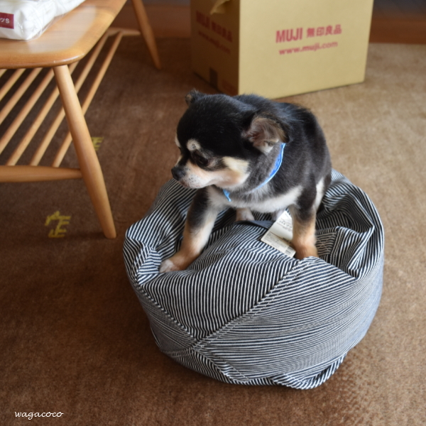 ヒッコリーストライプのパイプクッションはもんすけのステップになれば、、、