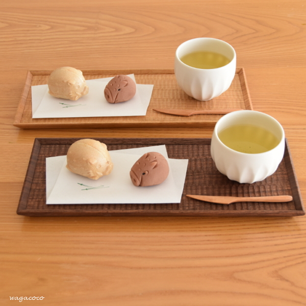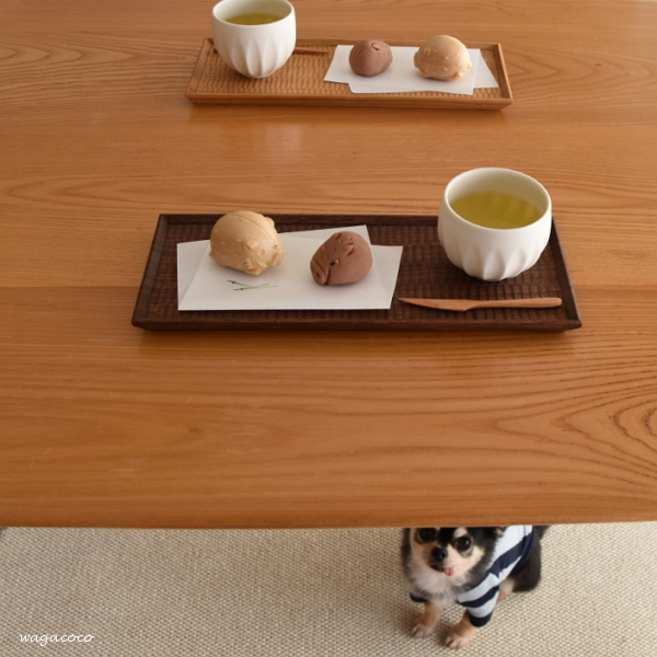 木工房玄さんの長方平皿に懐紙を敷いて、和菓子を二つ。