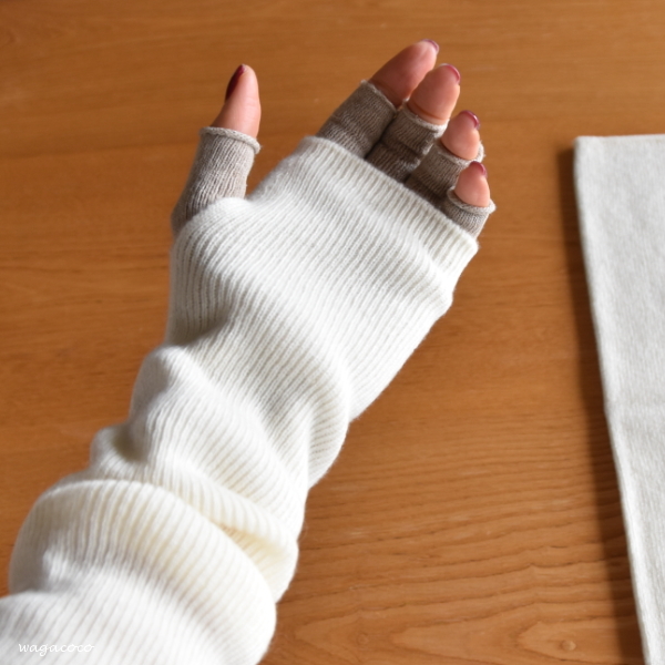 冷えとり靴下の841(ヤヨイ)さんのシルクハンドウォーマーとPRODIGALさんのカシミヤアームウォーマーの重ね付けです。