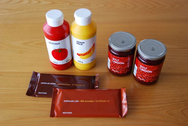 ケチャップとマスタード、リンゴンベリーのジャム、チョコレート。