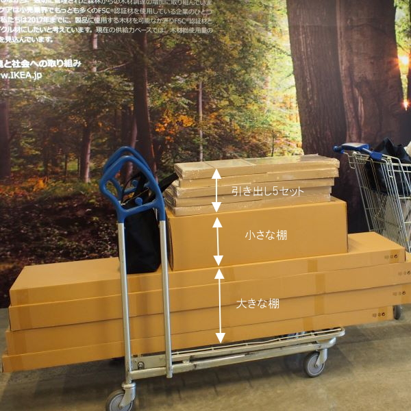 上から順に、引出し5セット、小さな棚、大きな棚。