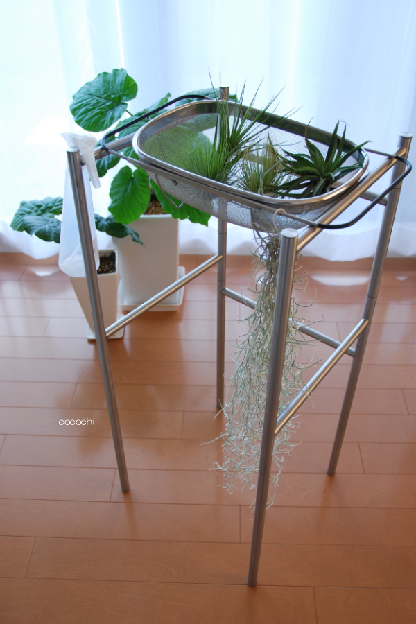イケアに行ってきました。収納スペース用のセンサーライトやインナークッションの他、植物のお手入れのための道具を購入。バス用品の折りたたみタオルスタンドとキッチン用品の水切りカゴを組み合わせて、ベランダにチランジア(エアプランツ)の水やりスペースを作ります。