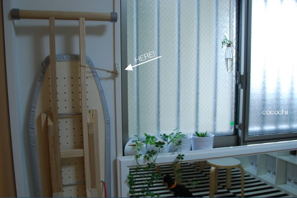 脚にゴムのストッパーが巻いてあるので、立てていても倒れてきませんが、念のため、麻紐をひっかけてます。