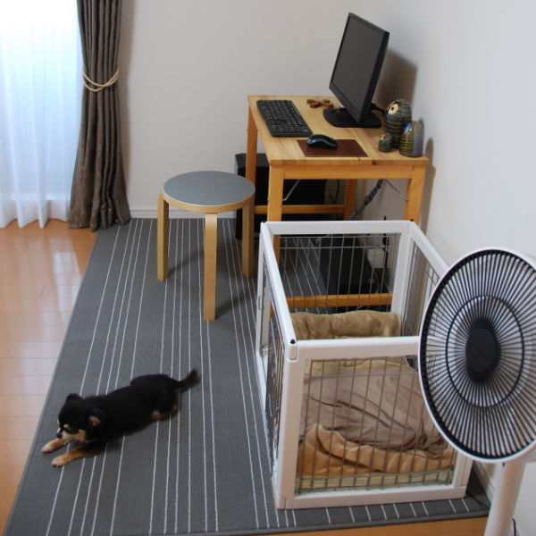 扇風機で風を拡散しつつもんすけと二人、快適な夏の午後を過ごしています。