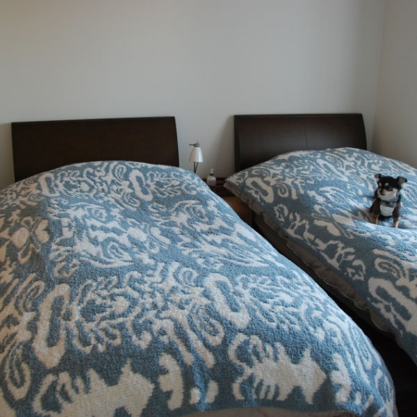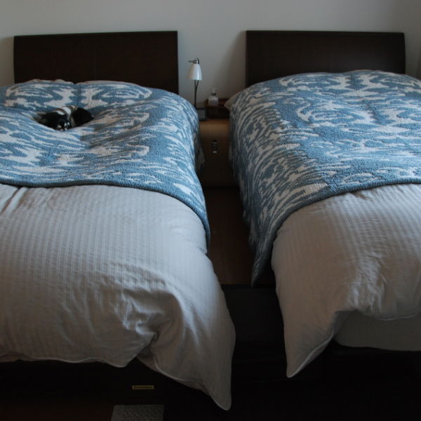カシウェアのブランケット Damask(ダマスク)の【 Silver Blue×creme 】2枚が届きました。伸縮性があって、優しくフィット。羽毛ふとんの上に掛けて使います。