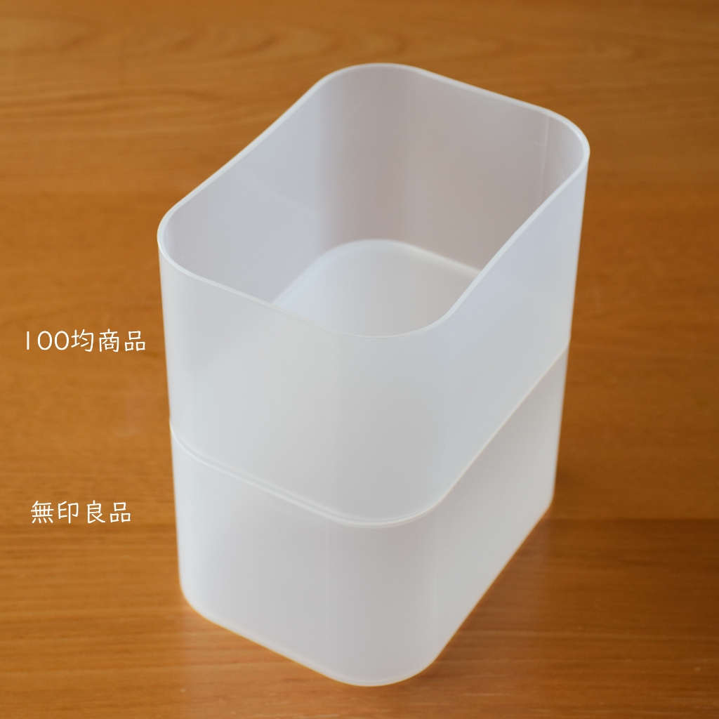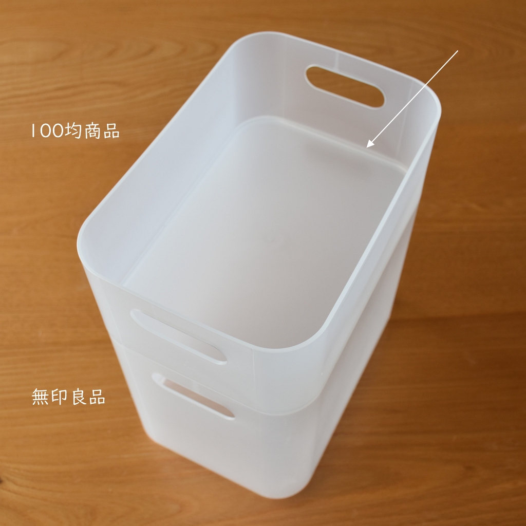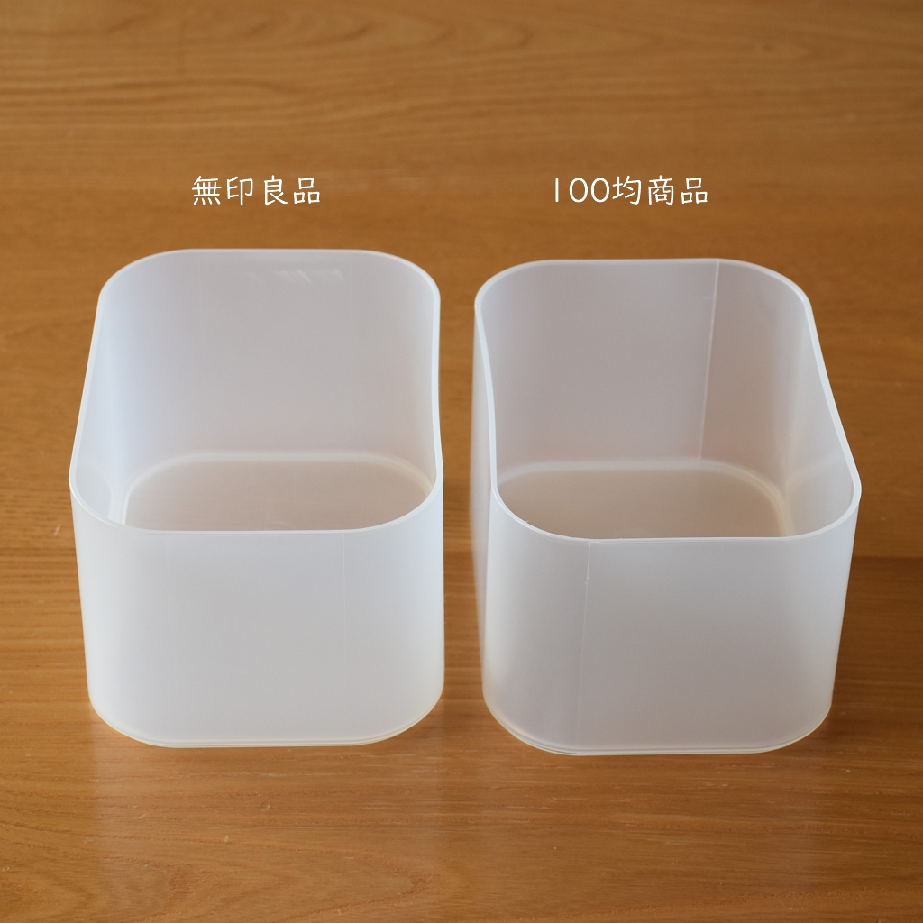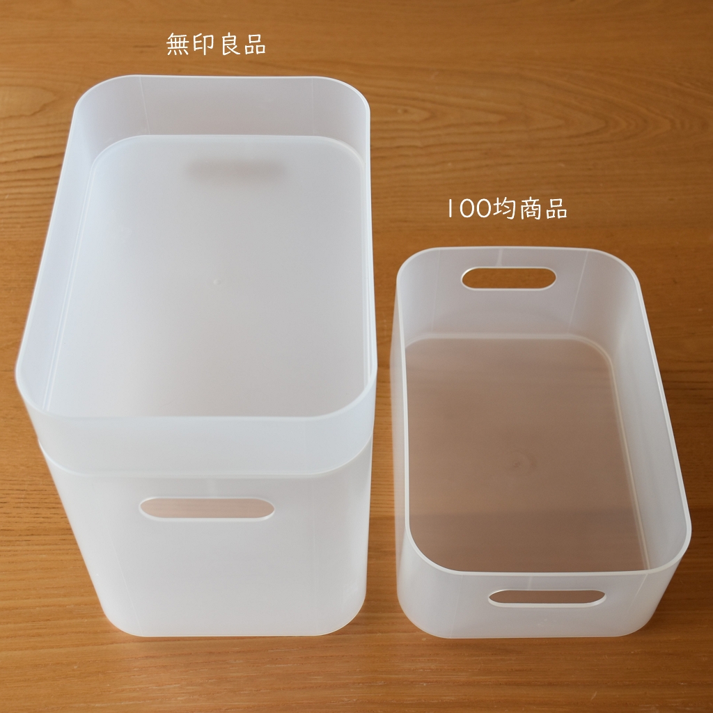 無印良品の【ポリプロピレンメイクボックス】(450円)と、【ポリプロピレンメイクボックス・1/4】(250円)と比較してみました。