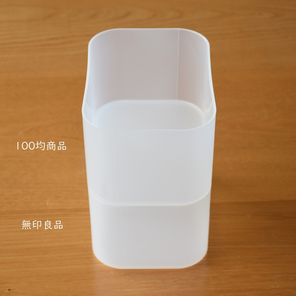 100円商品は少し歪みがあり、縦の線が気になりますが、無印良品のメイクボックスと重ねることは可能。