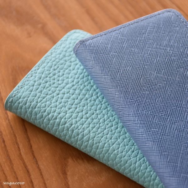 パステルカラーの本革にライチの皮のようなエンボス加工。