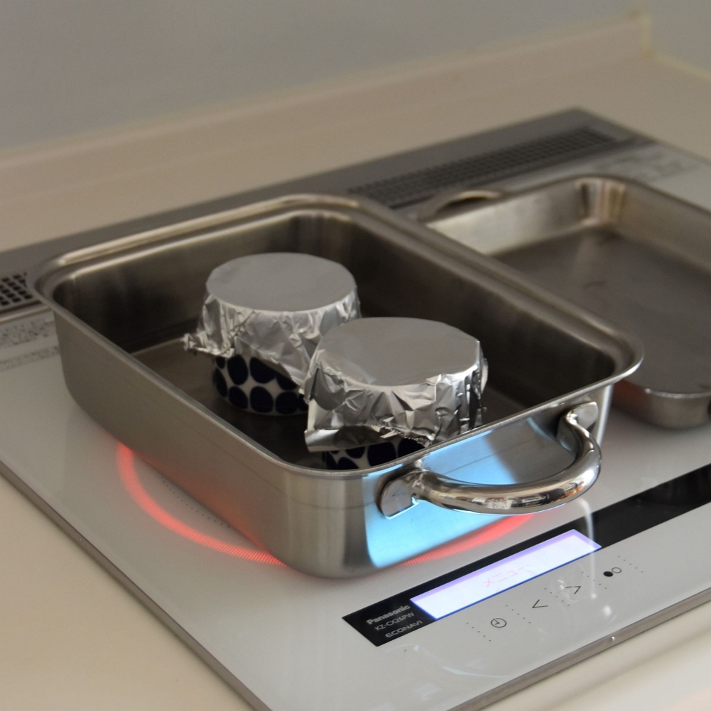 深グリルに2cmほどの水を入れて中火にかけ、沸騰したら器を入れ、浅グリルで蓋をして3分蒸し、弱火にして更に7分蒸しました。