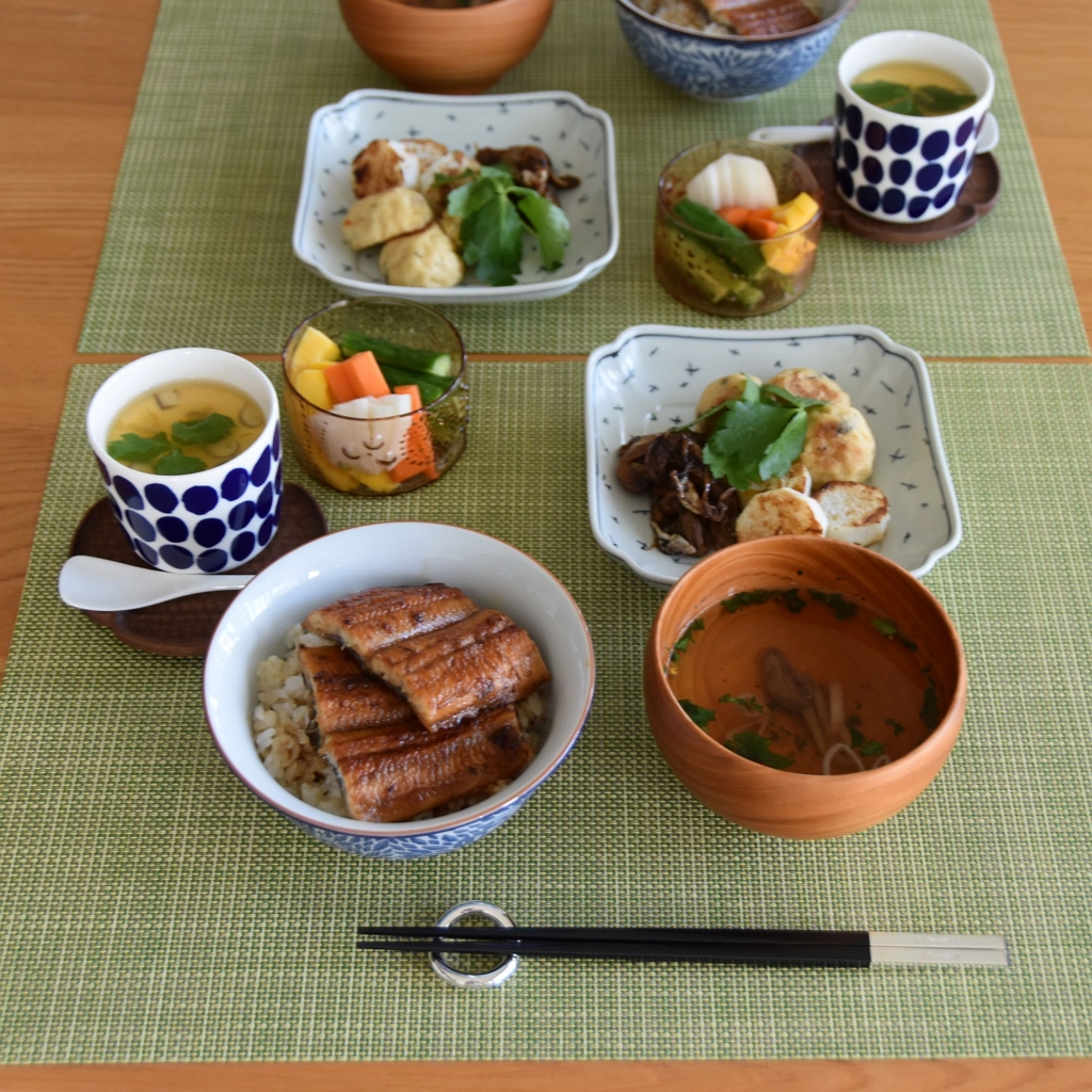 マリメッコのラテマグで茶碗蒸し、イッタラのフローラでぬか漬け、ロールストランドのオスティンディアで鰻丼、東屋の角皿に肝焼き。