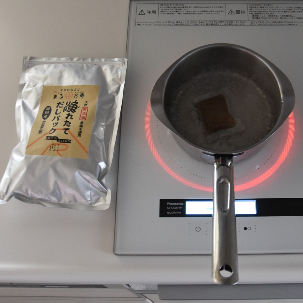 水200ccにだしパック1袋を入れ、沸騰してから5分間煮出し、火を止めてからだしパックを取り出さずに8時間ほど置いて、濃い目のだしが完成。