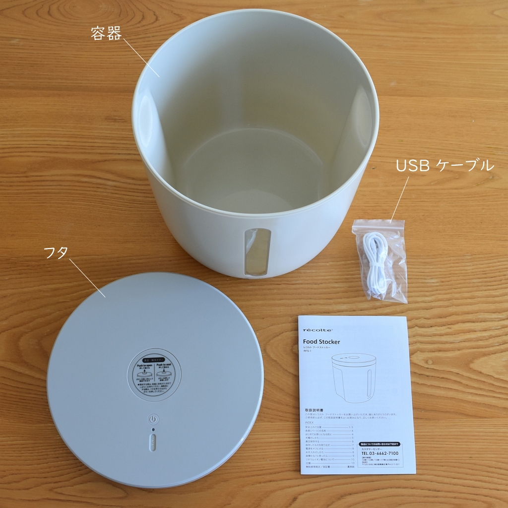 セット内容は、容量約7Lの保存容器、充電式のフタ、充電用のUSBケーブル。