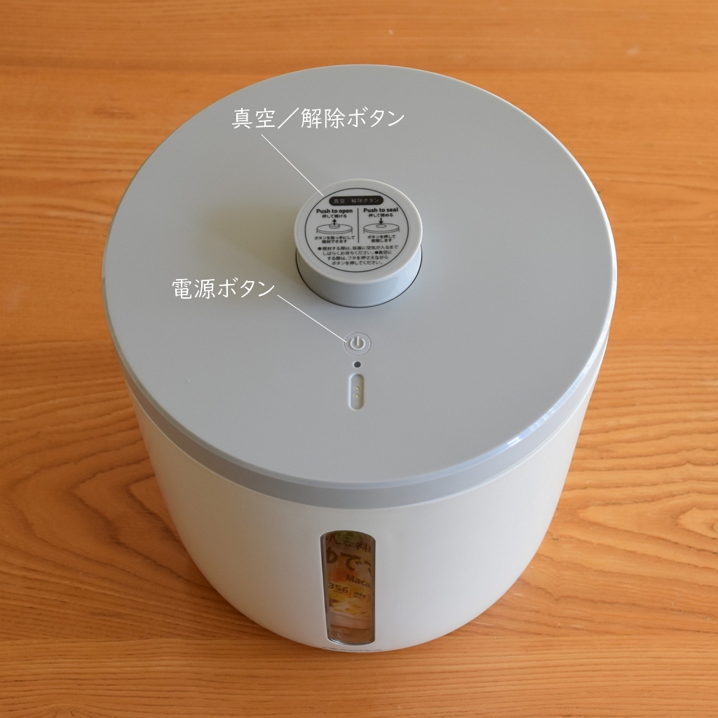 取り出す時にはフタのボタンを押して空気を入れるだけで手軽ですが、真空保存する際には、しばらくの間フタを押える必要があって多少の手間と数分の時間がかかるので、頻繁に使用するものを保存する場合には少し面倒に感じるかもしれません。