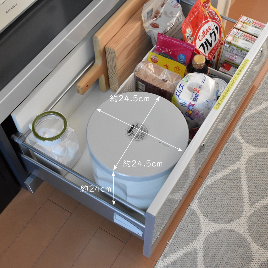 フタを閉めた保存容器のサイズは約W24.5cm×D24.5cm×H24cm。