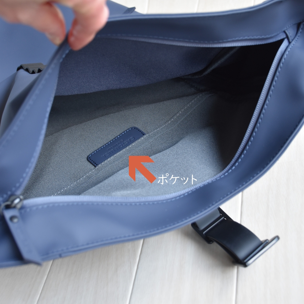 上部の入れ口にもファスナー、内側にもポケット付き。