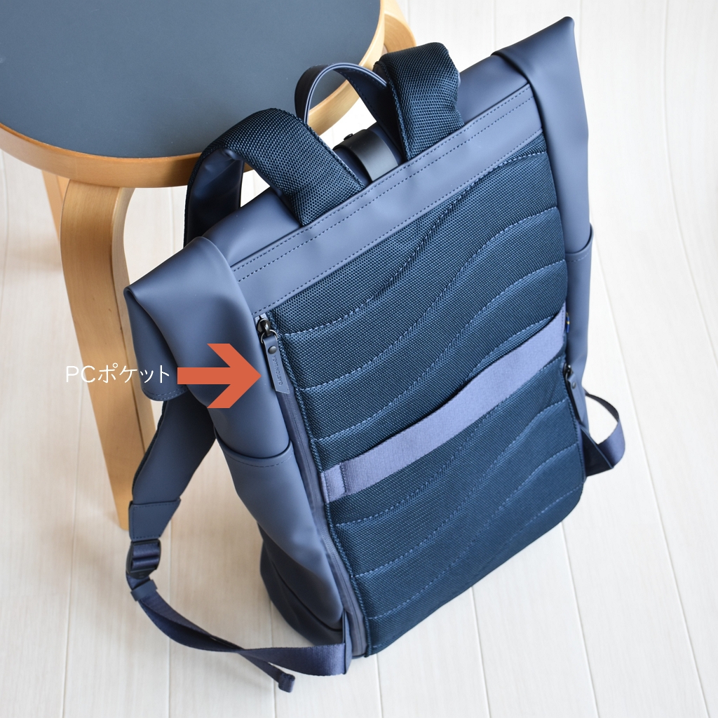 背面には16インチまでのPCを収納できるファスナー付き専用ポケット。
