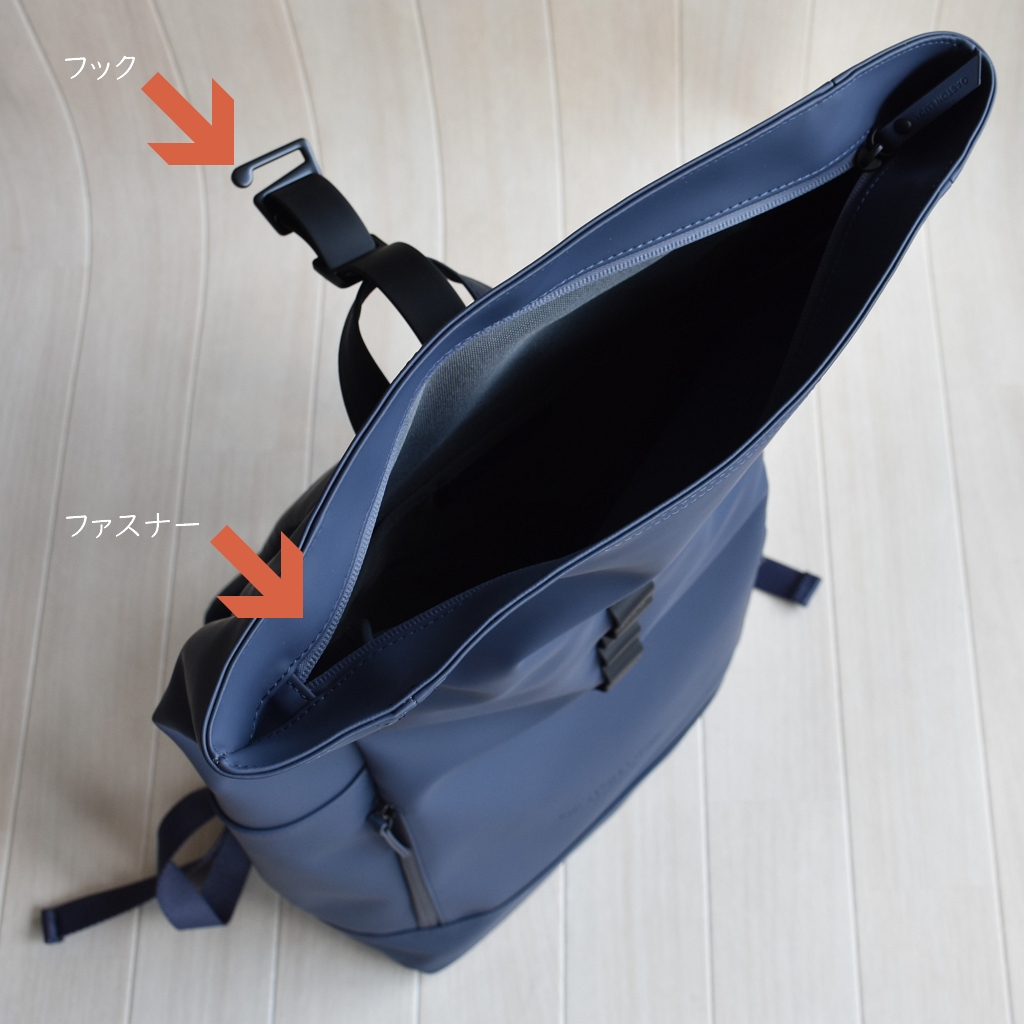 ファスナー口から荷物を入れ、中身の量に応じてフックで留める。