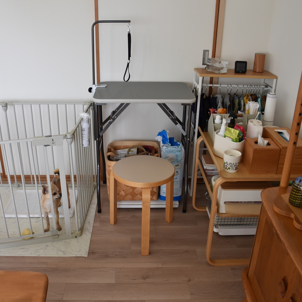 部屋の中で遊ぶときやお手入れのときの出入り口は、トリミングテーブルの横。