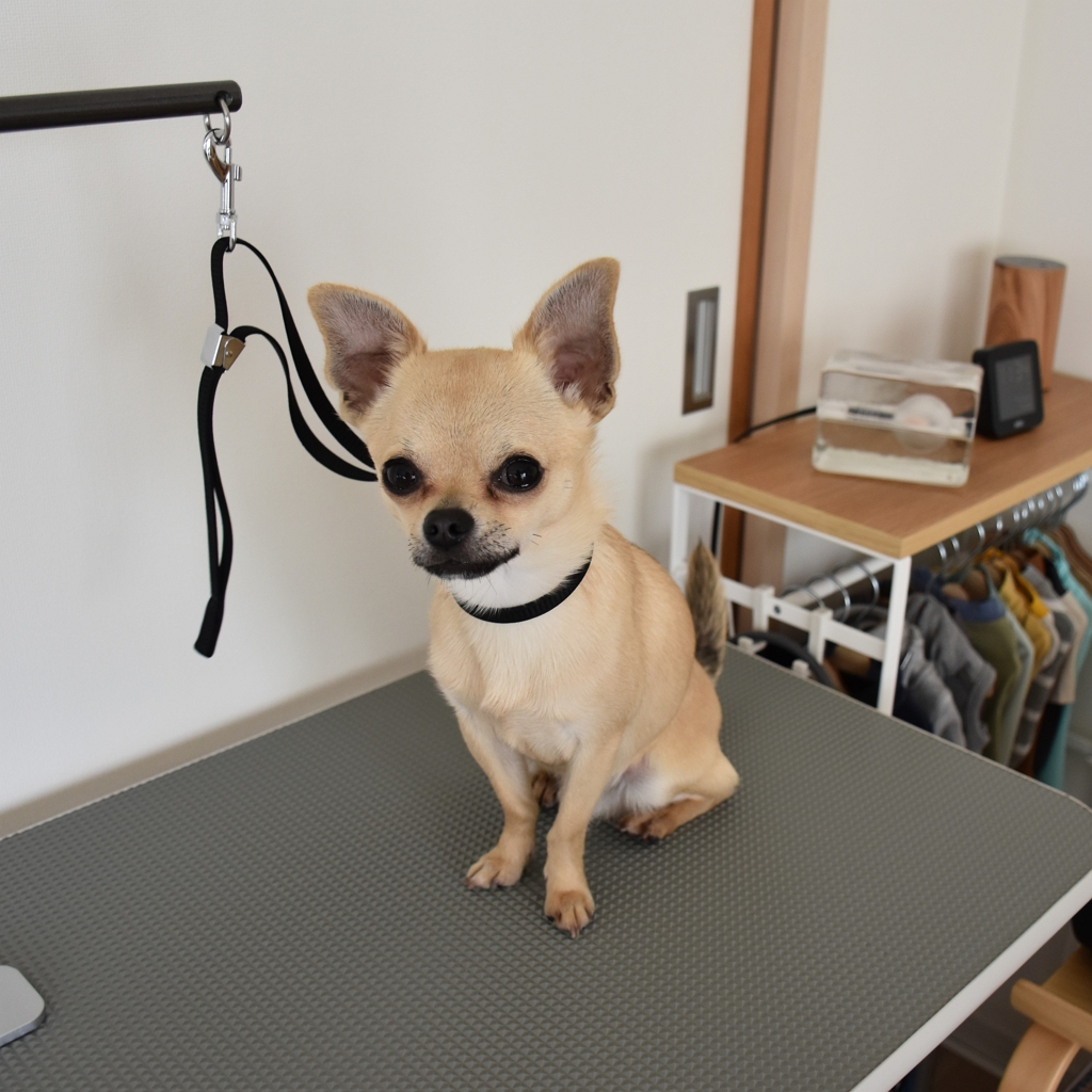 リビングで一緒に遊んだら、トリミングテーブルの上に乗るというルーチンで、トリミングテーブルに慣れてきたもんた。