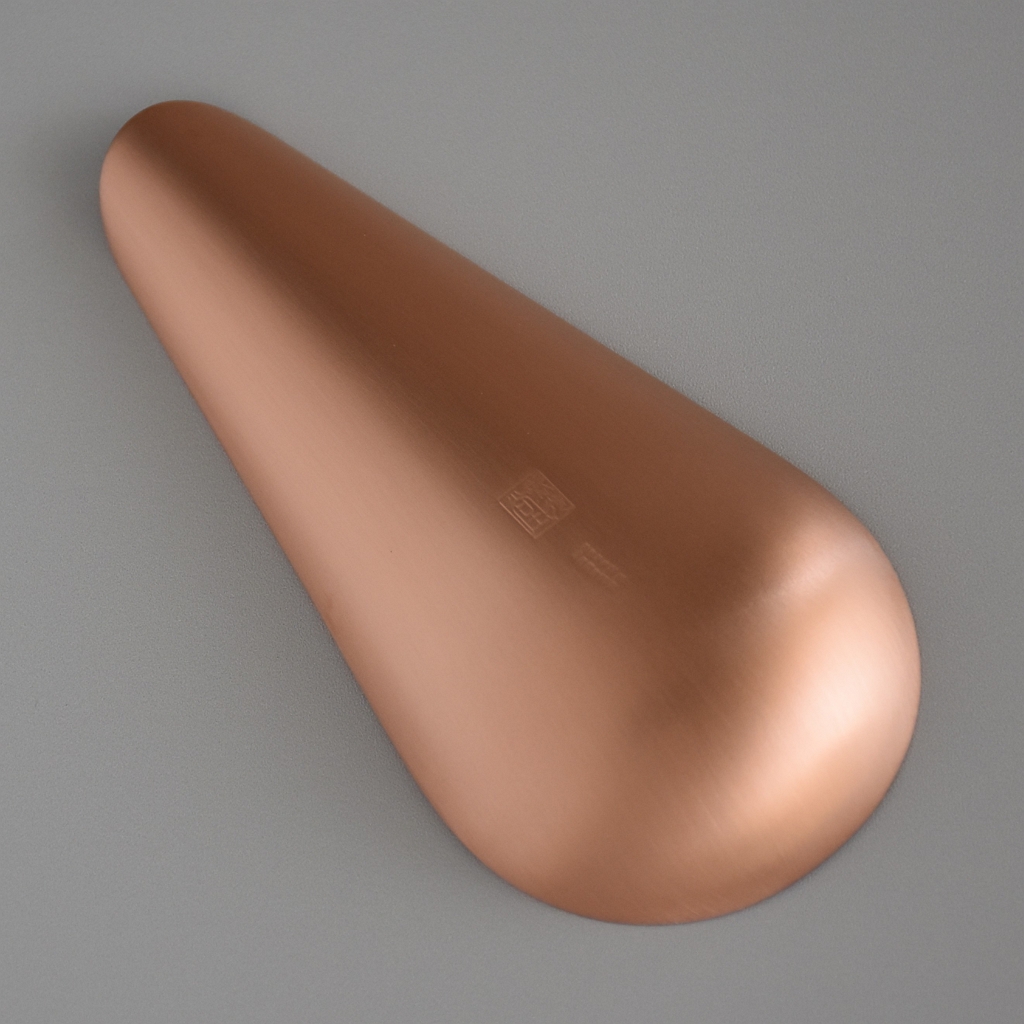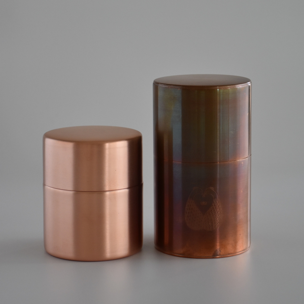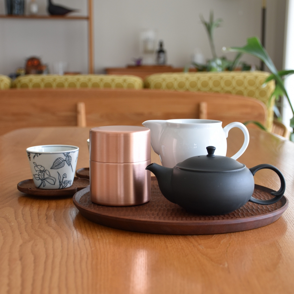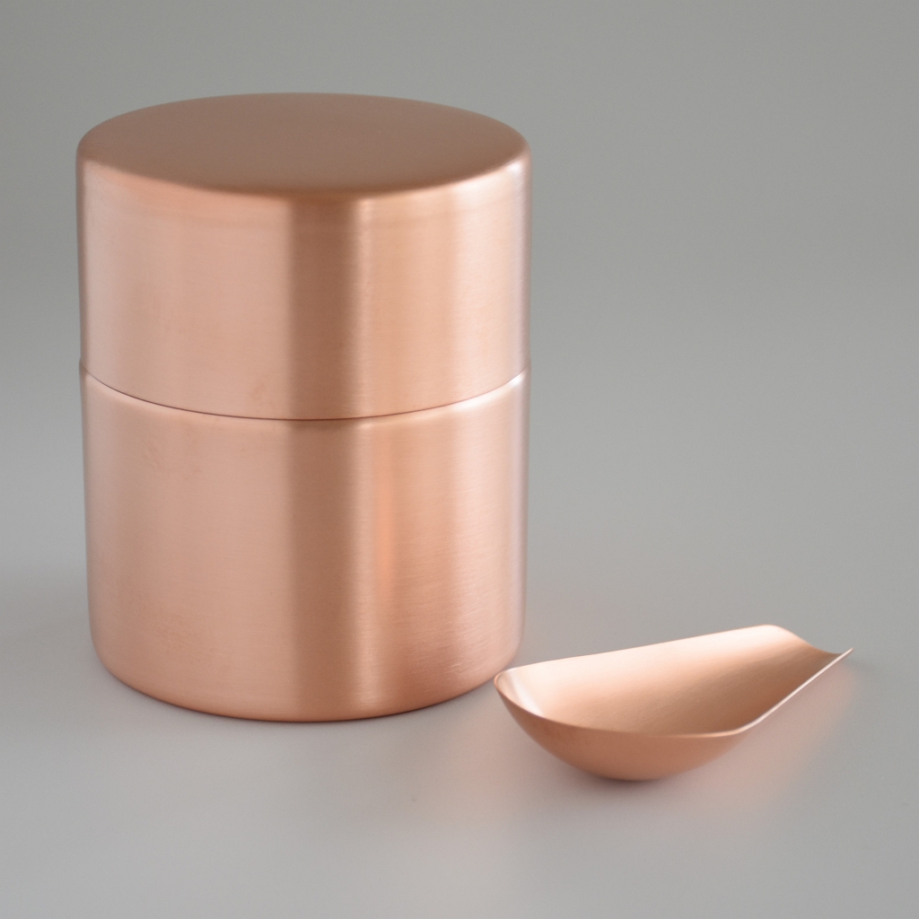 銅は、抗菌性が高く、茶器に適した素材です。銀色の品には、銅の地金の上に錫めっきを掛けてあります。錫は銅に比べてゆっくりと変化していくのが特徴です。光沢のある銀白色から深みのある銀色へ、ゆっくりと風合いを増していきます。銅色の品は、地金の銅そのものです。新らしい銅ならではのきれいな赤金色から、深みのある飴色へ。使い込む程にあらたな表情をみせ、飽きることなくお使いいただけます。