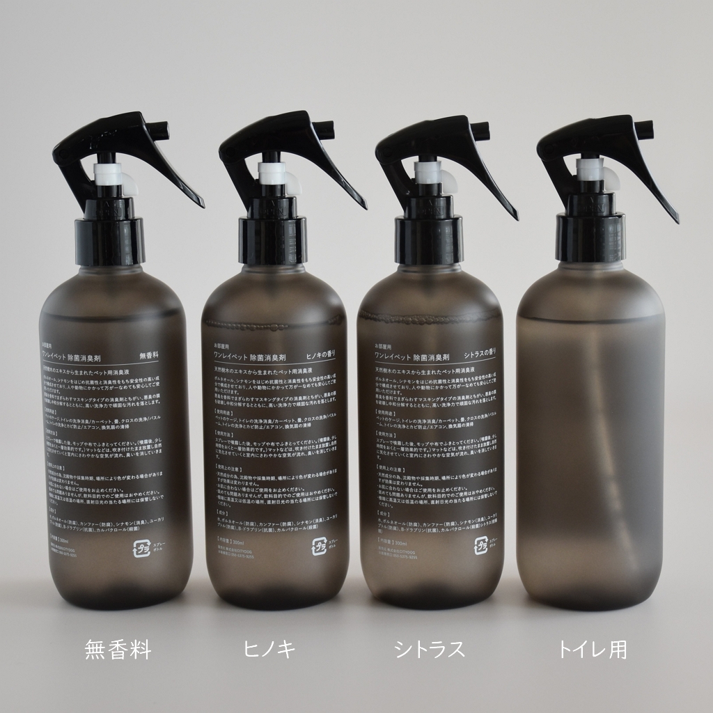 もんたはヒノキもシトラスも嫌がりませんでしたが、香り付きの消臭剤でお掃除したところ、お掃除跡を舐めていたので、無香料をもんた用にしました。