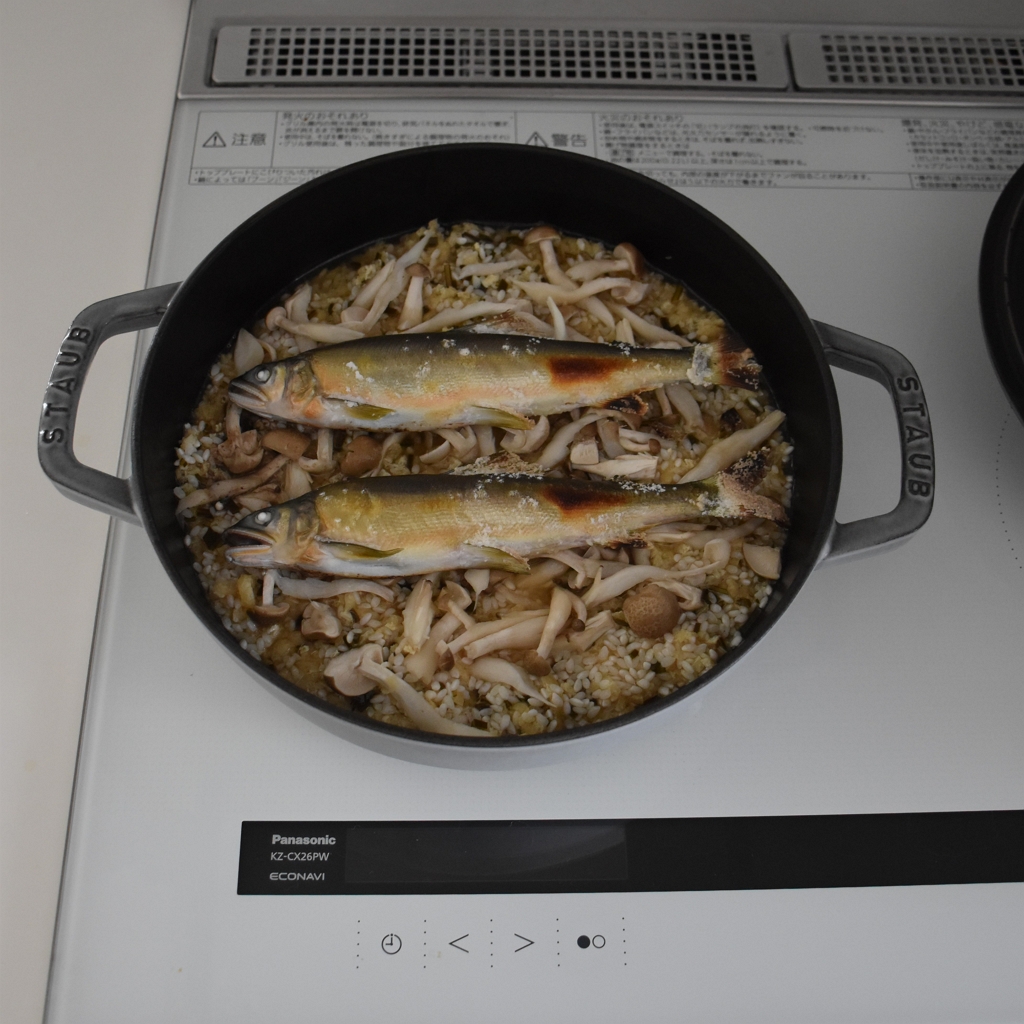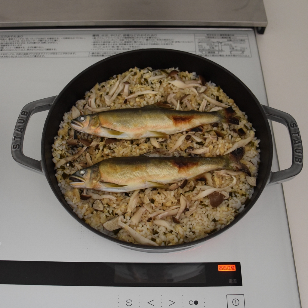 塩焼きにした鮎を、白米、だし汁、具(今回は、みじん切りの油揚げと昆布、しめじ)の上にのせる。