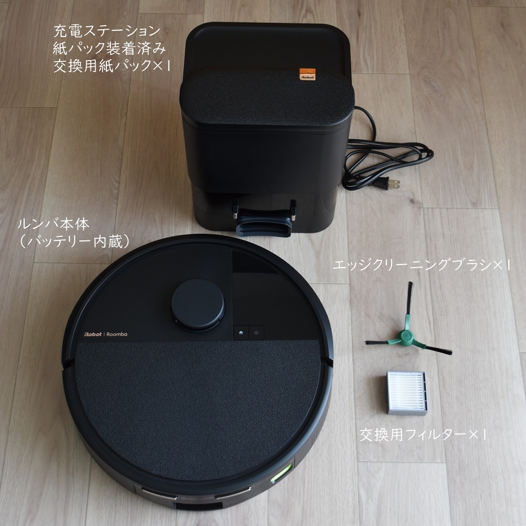 セット内容は、ルンバ本体(バッテリー内蔵)、AutoEmpty™ 充電ステーション(電源コード一体型、紙パック装着済み)、交換用紙パック×1、交換用フィルター×1、エッジクリーニングブラシ×1。
