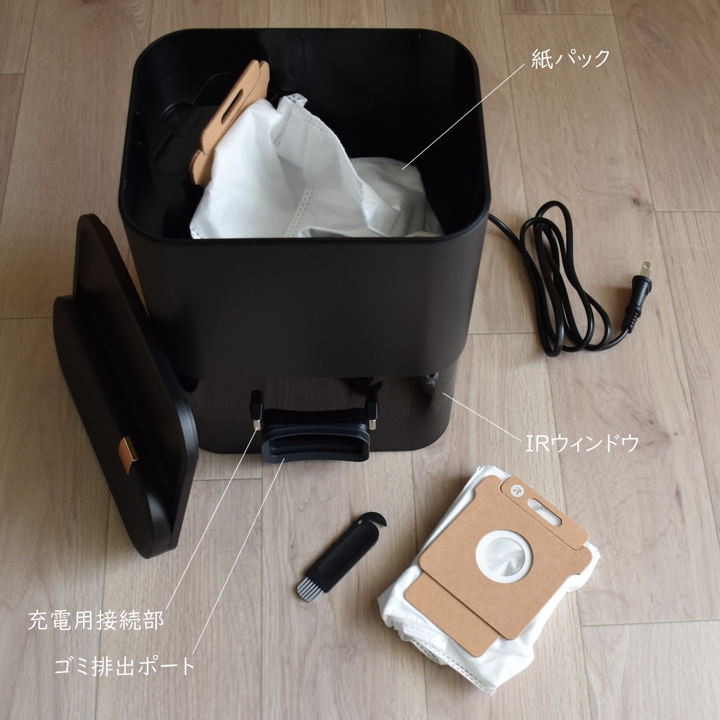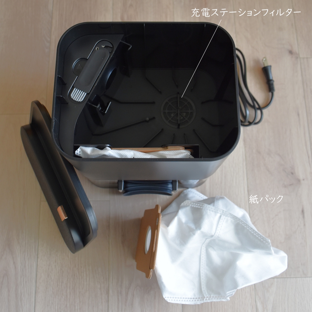 ゴミ排出ポートから吸い上げられたゴミは充電ステーションの紙パックに溜まり、いっぱいになったら交換。