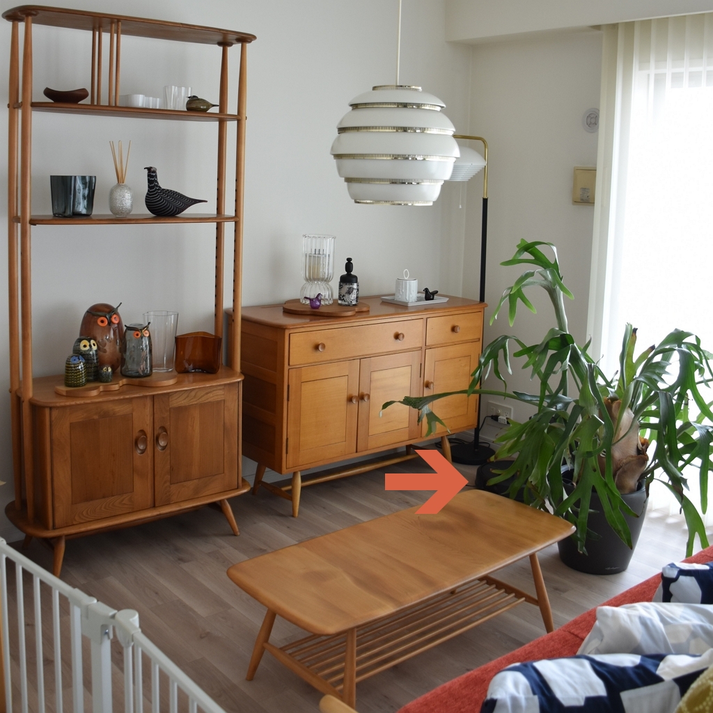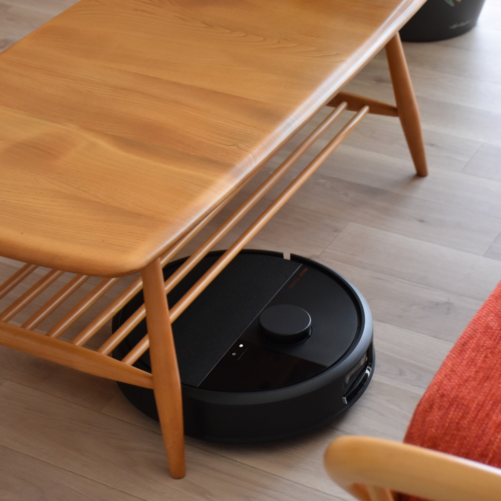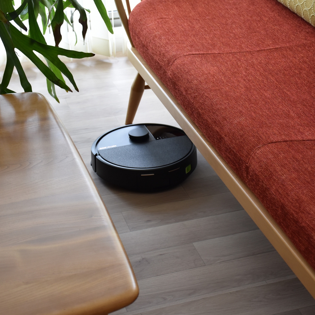 カウチソファの下も、コーヒーテーブルの下も、脚を避けてスイスイ。