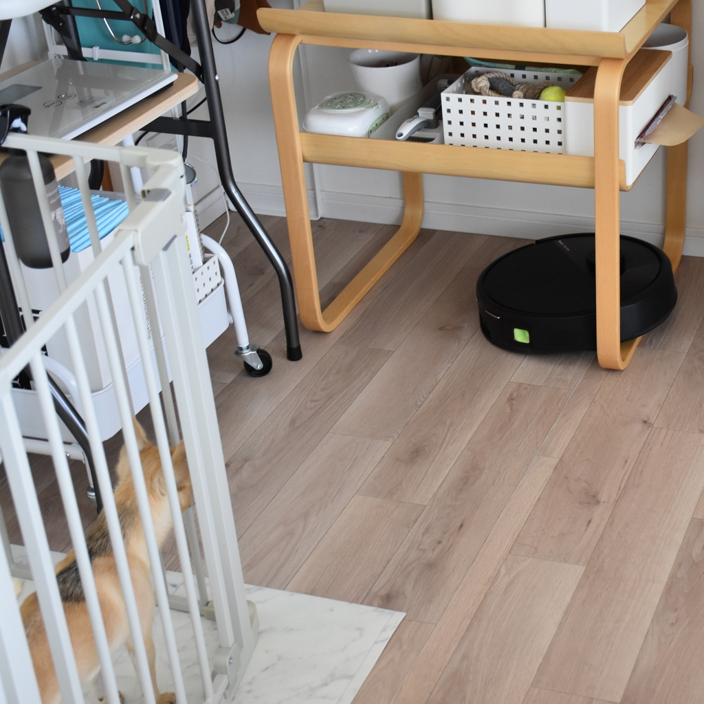 先犬もんすけが1歳半のころに購入した当時のルンバは、ガッツんガッツんと、家具や壁にぶつかっていたし、エラーで動けなくなっていたり、ダスト容器の掃除が面倒だったり。
