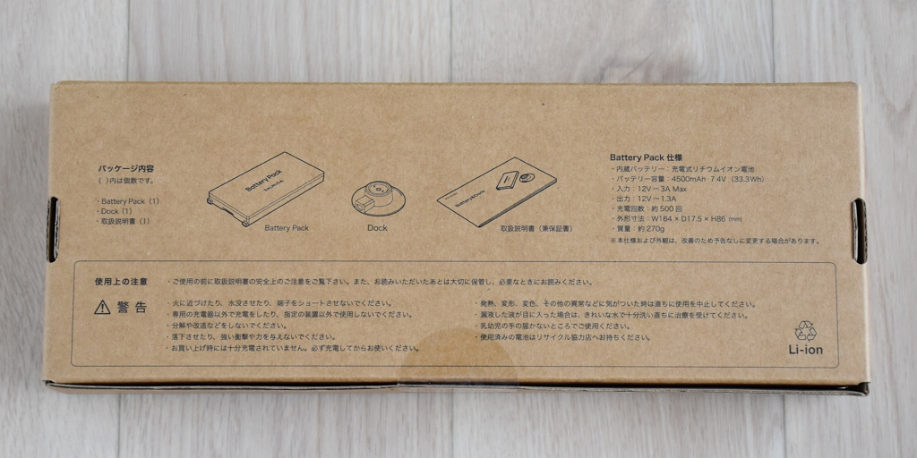 セット内容は、Battery Pack、Dock、取扱説明書(兼保証書)。
