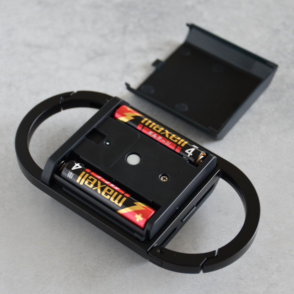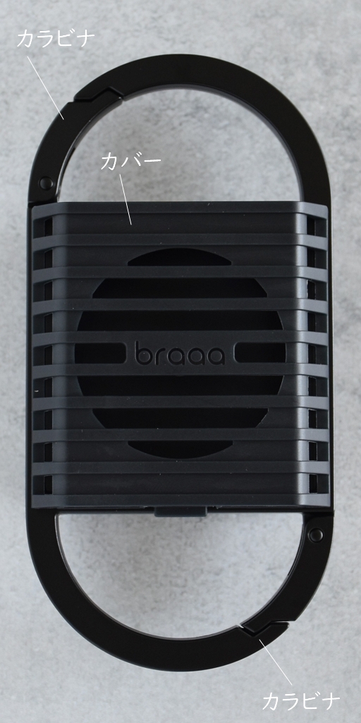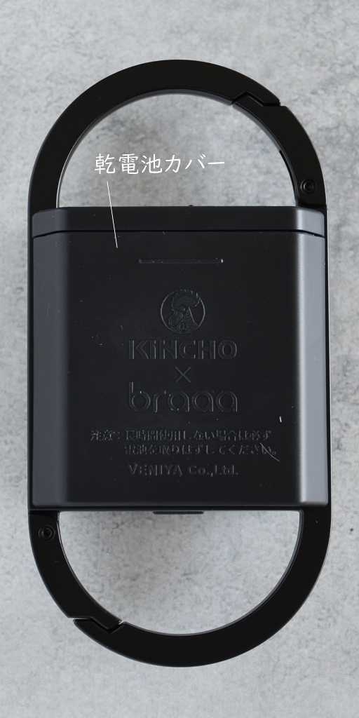 上下はカラビナになっていて、前面はスリットのあるカバー、背面は乾電池カバー。