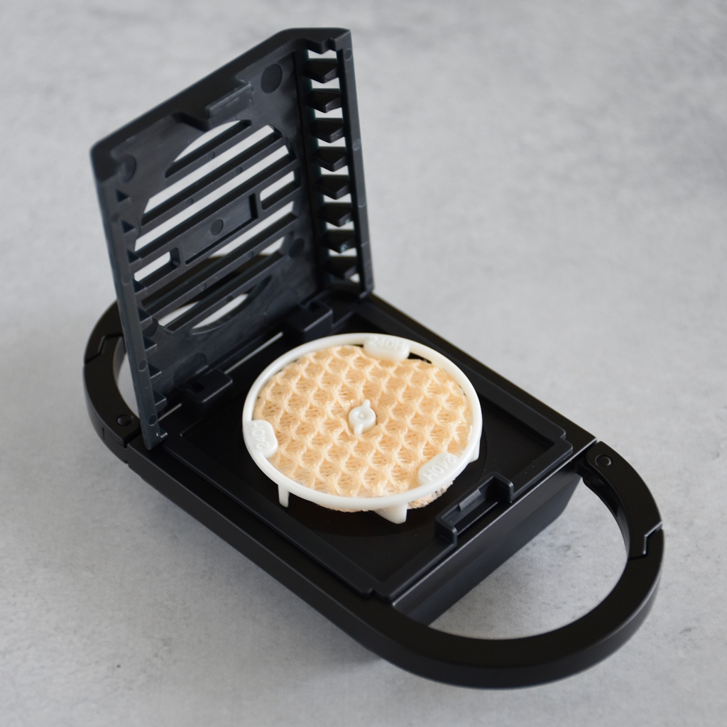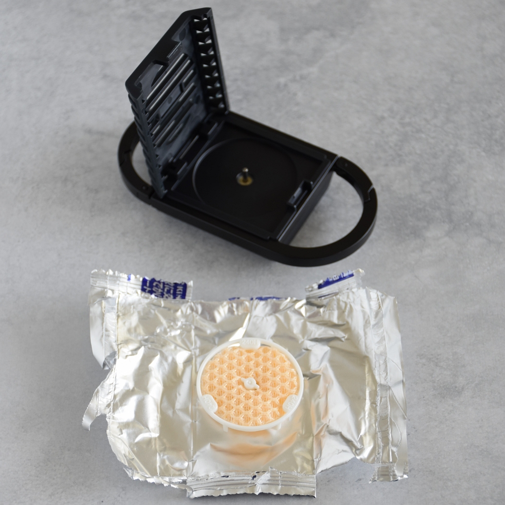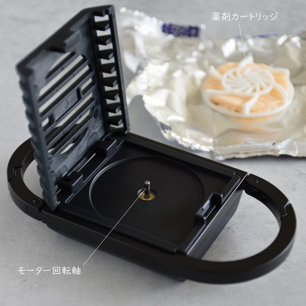 フロントのカバーを開け、中央のモーター回転軸に薬剤カートリッジを取り付ける。