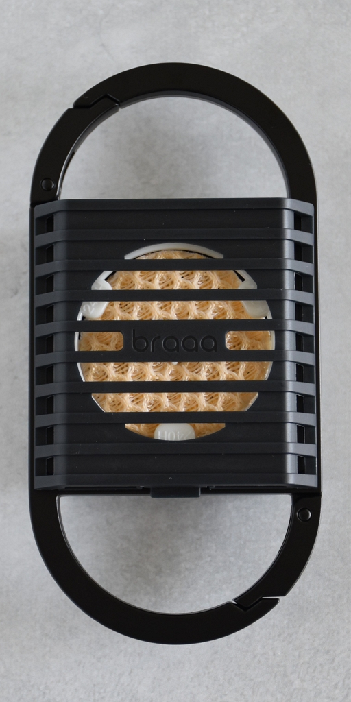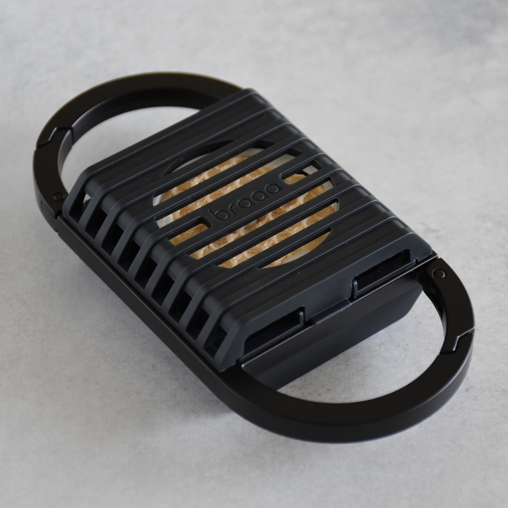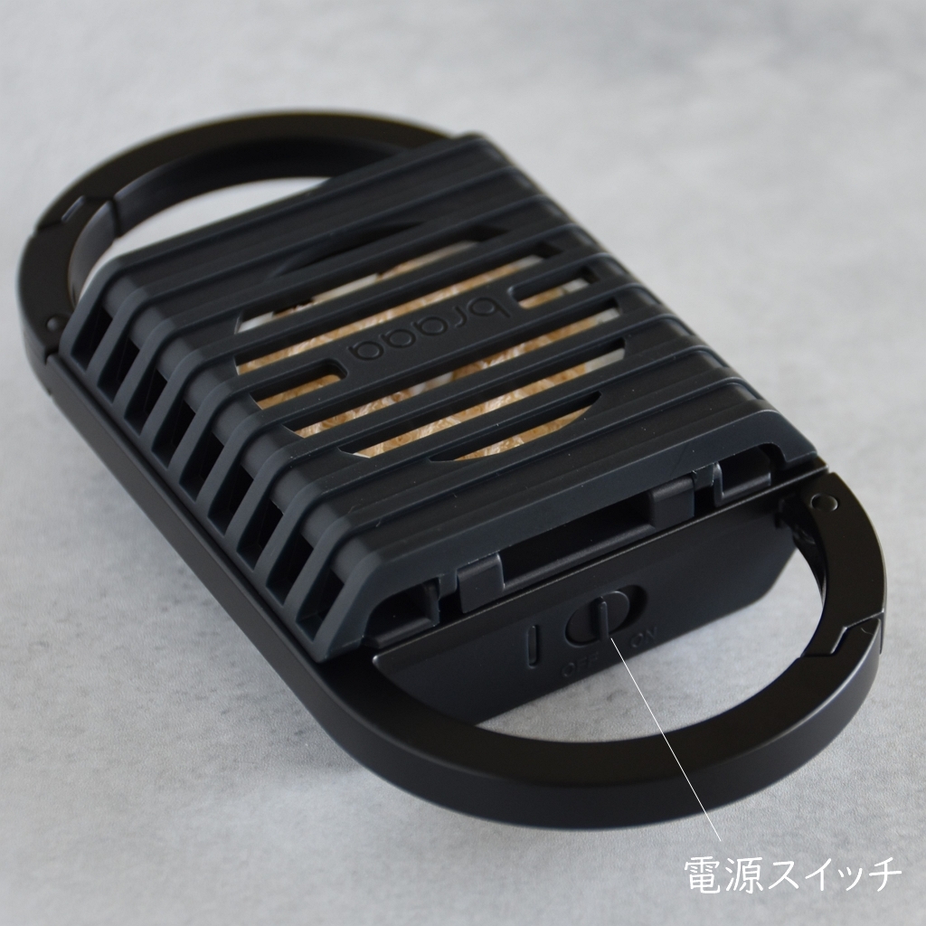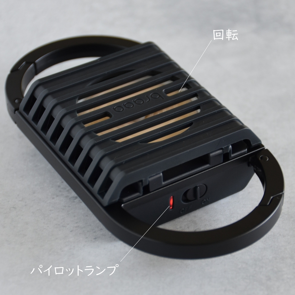 モーターが回る稼働音はとても小さく、お散歩中に屋外で使う分にはほとんど気にならず、本体にカラビナが付いているので、いろんな場所に取り付けて使えるのも便利。
