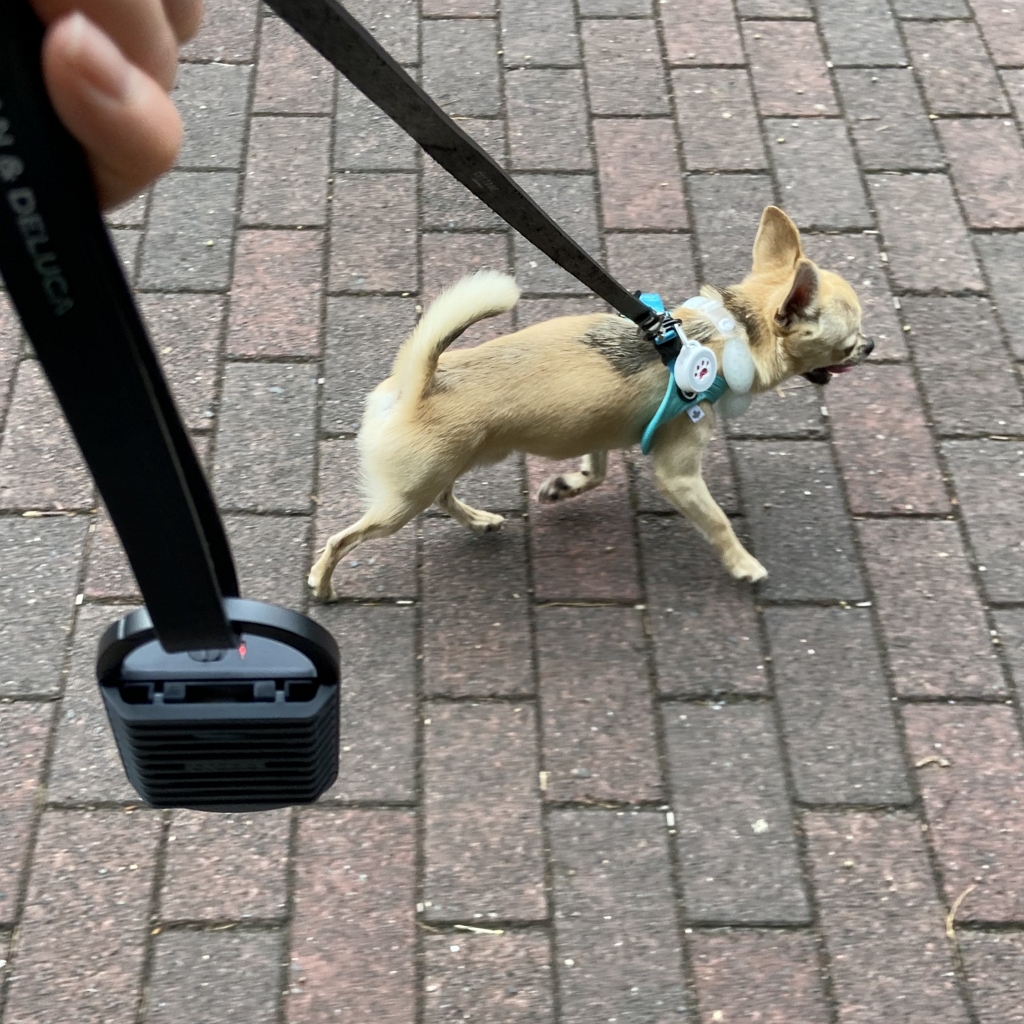 ですが、それなりに大きく、それなりに重量があるので、試しにリードの端に付けてみたら、ゆらゆら揺れてちょっと邪魔でした。