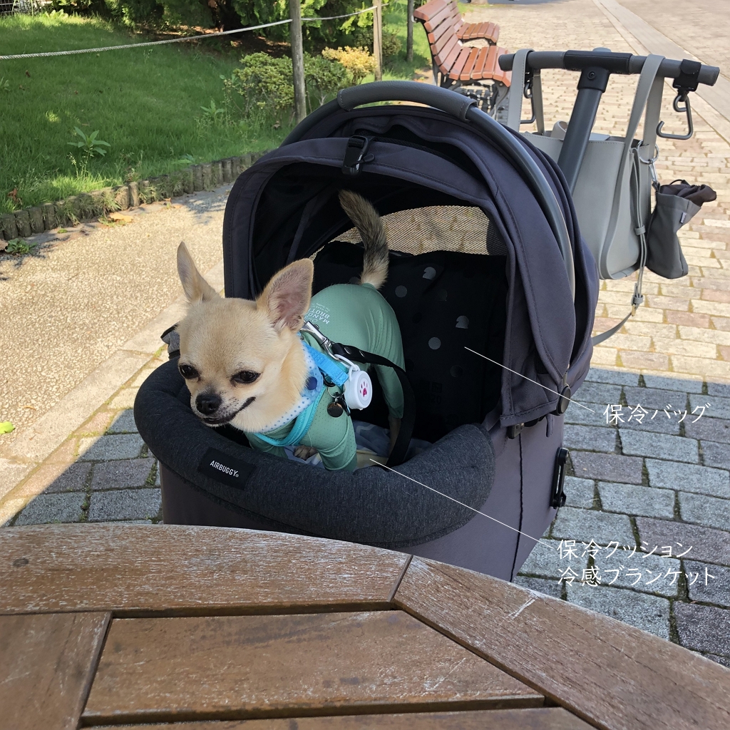 カートの中にはエアバギーのクールクッションを敷いて、保冷剤をたっぷり詰めた保冷バッグも一緒に置いているので、カートの内側はひんやり。