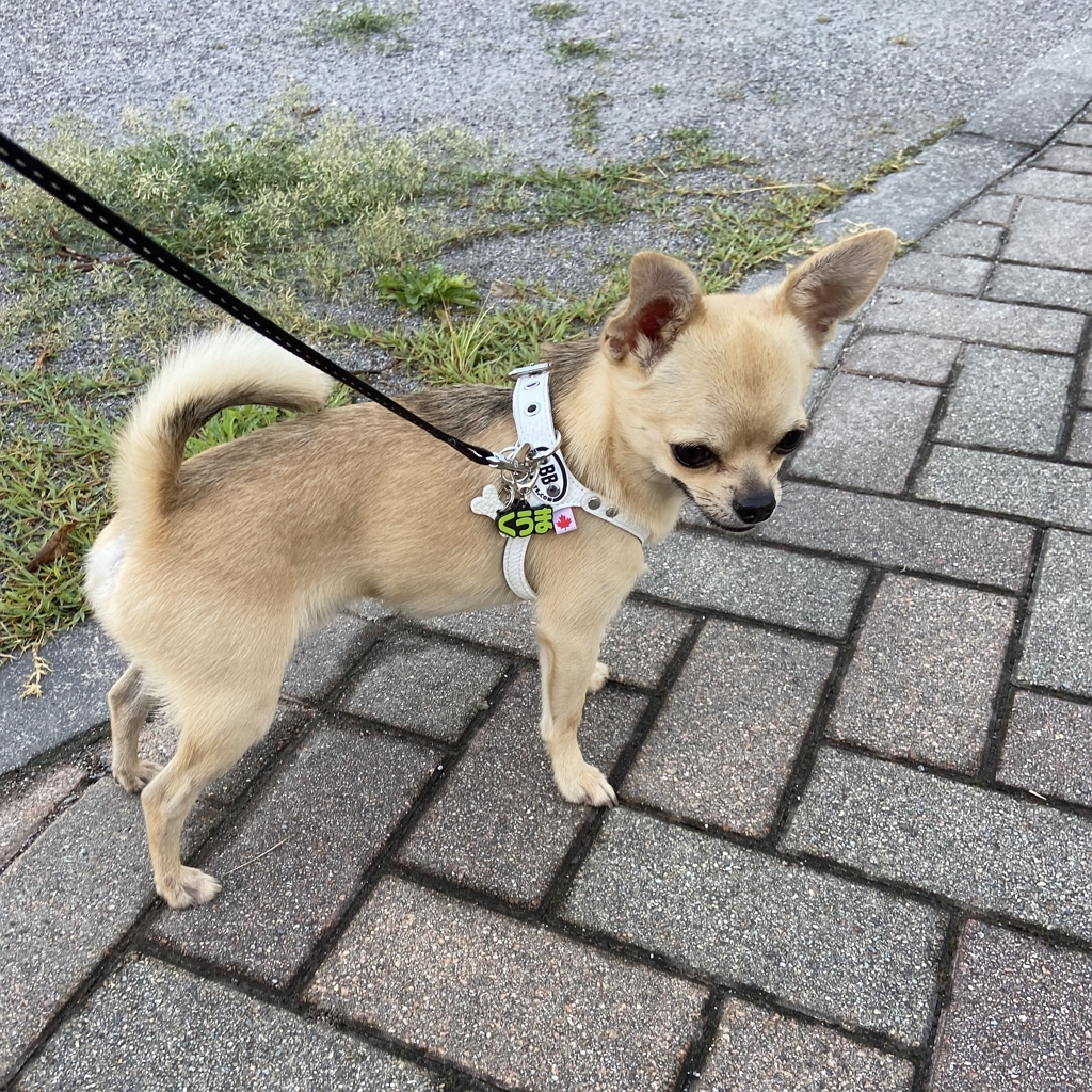夏季連休中、少し涼しい朝に、クールネックリングを付けず、カスタマイズしたバディーベルトを着けてお散歩に繰り出しました。