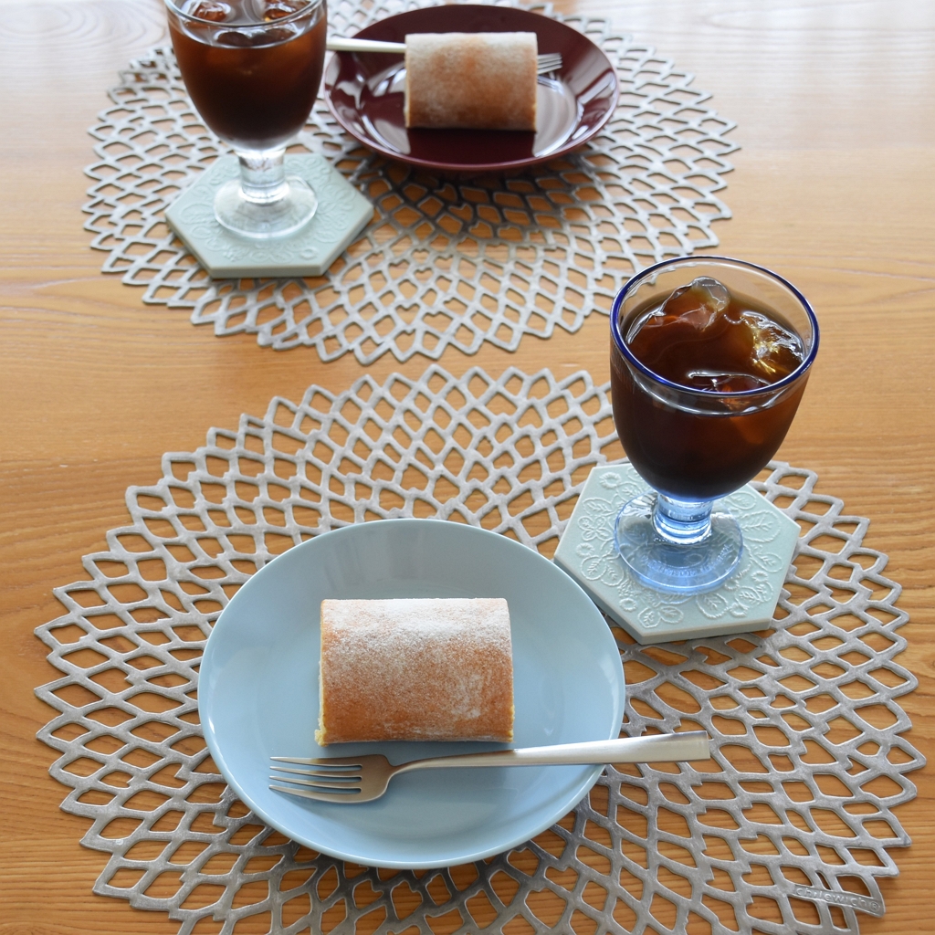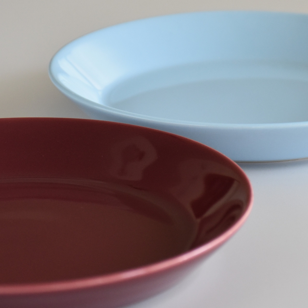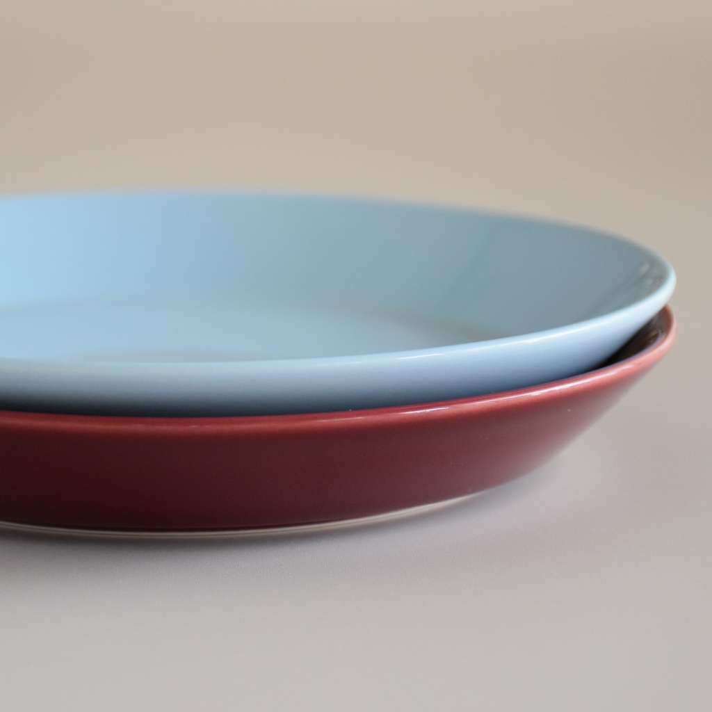 色味でテーブルコーディネイトに季節感を出したいならチェリー、季節問わずいつでも気軽に使いたいならアイスブルー、色の調和を楽しみたいなら両方一緒に。